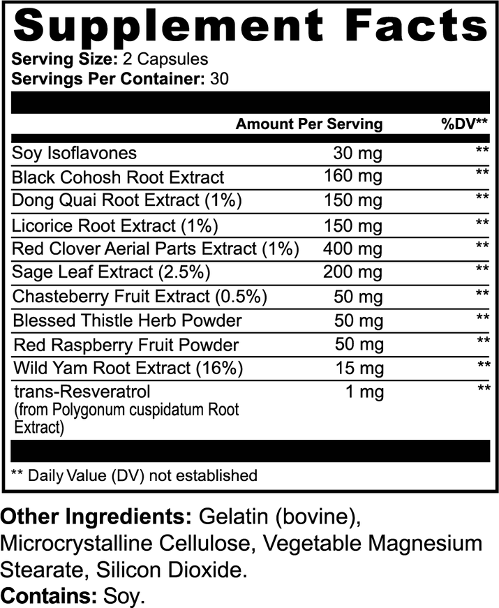Answer 1: The supplement contains several botanical extracts including Dong Quai, Red Clover, Black Cohosh, and Sage Leaf, known for supporting hormonal balance, reproductive health, and overall well-being. Each ingredient has traditional uses: for instance, Black Cohosh is often used for menopausal symptoms, while Red Clover may support menstrual wellness.